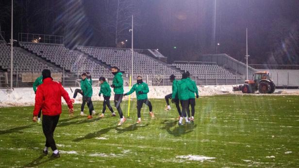 Das Abschlusstraining von Rapid für die Partie gegen Rakow ging in den Schneemassen unter. Trainer Peter Stöger ist sauer auf die UEFA.