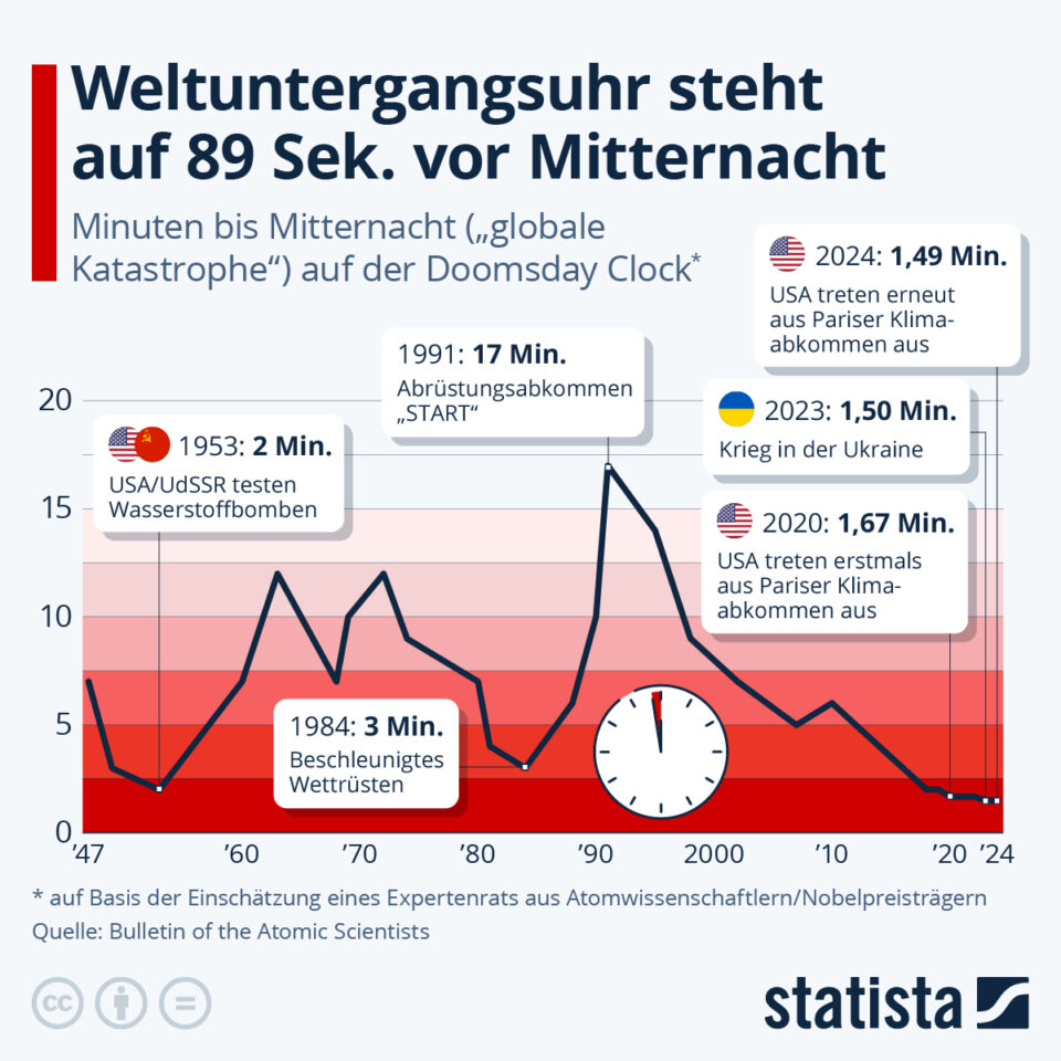 NEWS Politik/AuslandWarum die “Weltuntergangsuhr” so nah an Mitternacht ist wie nie zuvor by AUSZTRAJOB NEWSJanuary 27, 20260 Share0 Gefahr, dass sich die Menschheit durch einen Atomkrieg oder die selbst verschuldete Erderhitzung auslöscht ist so groß wie nie zuvor seit Erfindung der Uhr 1947.