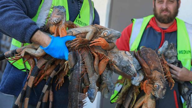 Die Leguane fallen von den Bäumen. Grund dafür sind ungewöhnliche Temperaturen unter 10 Grad, die die Tiere in eine Kältestarre versetzen. Der Sunshine State hält seine Bürger an, die Leguane aufzulesen und abzugeben.
